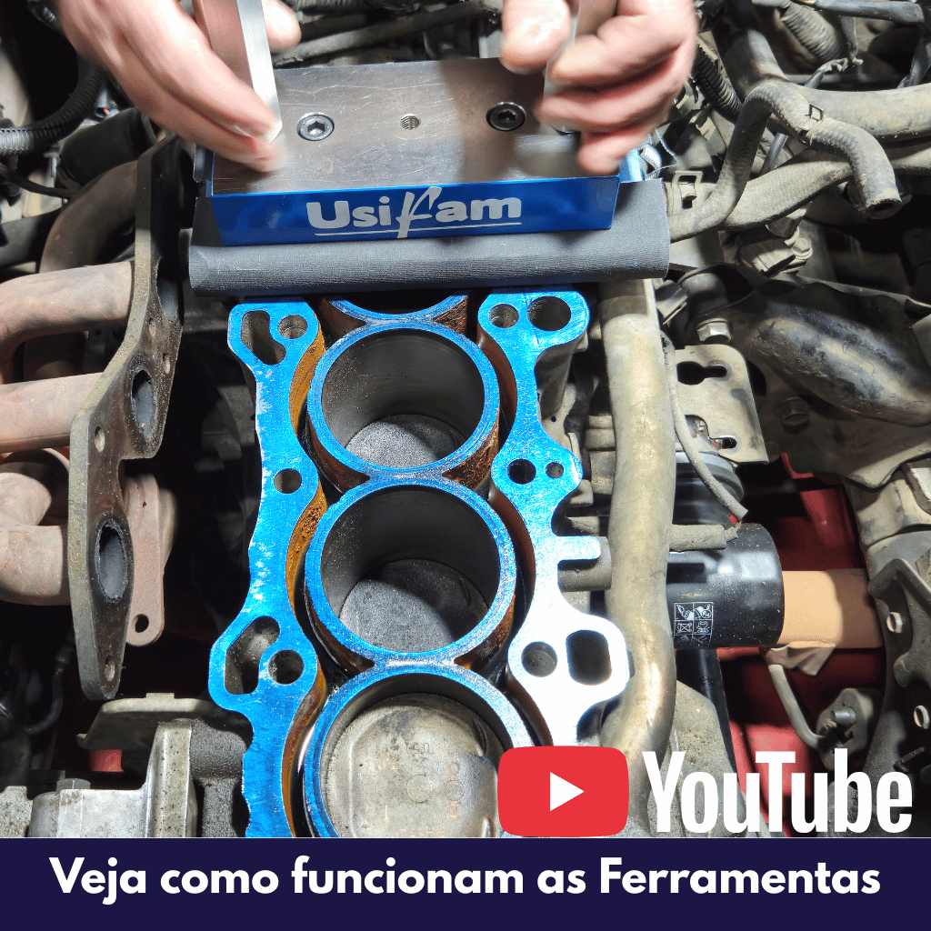 Plaina Para Blocos Motores (sem Tirar Do Lugar) + Régua 33cm. SOMOS O FABRICANTE DESSE PRODUTO. Kit composto por 02 ferramentas: 1. REGUA PARA VERIFICAR EMPENAMENTO DO CABEÇOTE/BLOCO 2. PLAINA PARA RETIFICAR/PLAINAR O BLOCO NO LUGAR. + ACESSORIOS Ferramentas ideais para fazer a aferição e correção de empenamentos leves em blocos de motores a combustão, tanto em blocos de alumínio como de ferro fundido. Pode ser usadas em cabeçotes também. O mais interessante é que com essas ferramentas você não precisa retirar o bloco do lugar para efetuar a aferição e a correção do empenamento se houver necessidade, faz com o bloco fixado no veículo mesmo. Características dos produtos Plaina: - Dimensão base inferior (lixamento) - 100 x 200 mm - Manípulos em alumínios - Diversas posições para fixação dos manípulos (intercambiáveis) - Bases retificadas com alta precisão - Bases fabricadas em aço - Peso aproximado total - 8,5 kg - Sistema sanduíche para fixação da lixa. Régua: - Dimensão 60 x 76 x 330 mm - Peso aproximado total - 3,2 kg - Retificado 2 faces de trabalho - Aço carbono - Ótima rugosidade - Ótima precisão Dimensional - Pintura de alta resistência - Ótima planicidade O kit contém os itens: 1 (um) Plaina manual tipo sanduíche 1 (um) Régua de verificação de empenamento 1 (uma) Caixa em madeira MDF para armazenamento da Régua 1 (uma) Caixa em madeira MDF para armazenamento da Plaina 1 (um) Rolinho para passar pasta de desempeno na régua 1 (um) Pasta de Ajuste na Cor: azul 60g marca USIFAM - Uso profissional - Auxilia diagnóstico em mecânicas para verificação se o cabeçote e bloco estão empenados e realiza a correção da planicidade se houver necessidade - Evita gastos desnecessários com serviço de retífica - Alta precisão e confiança dimensional - Original USIFAM Produto Original.