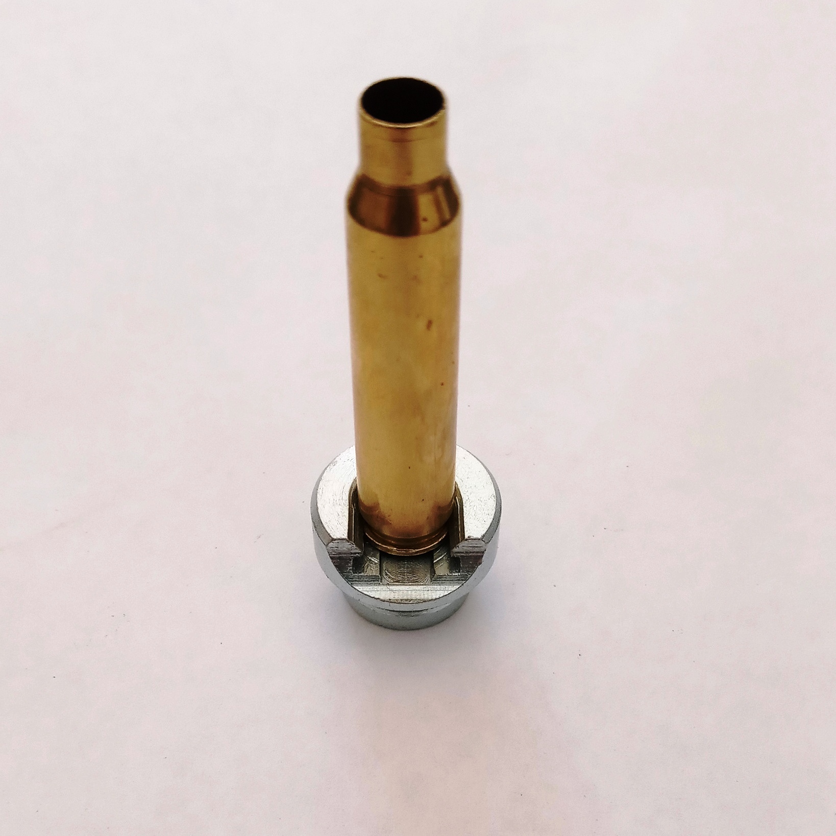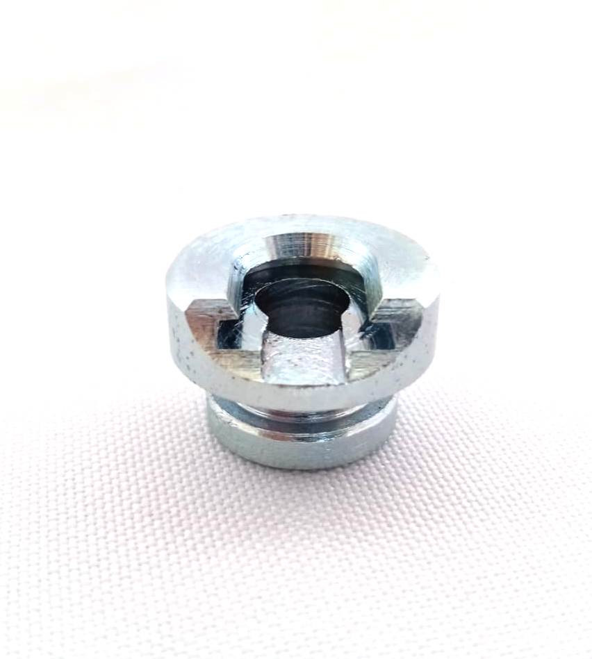 Peça fabricada em aço carbono SAE 1045 com revestimento de zinco (não enferruja).. Essencial para garantir a fixação precisa do estojo durante o processo de recarga..